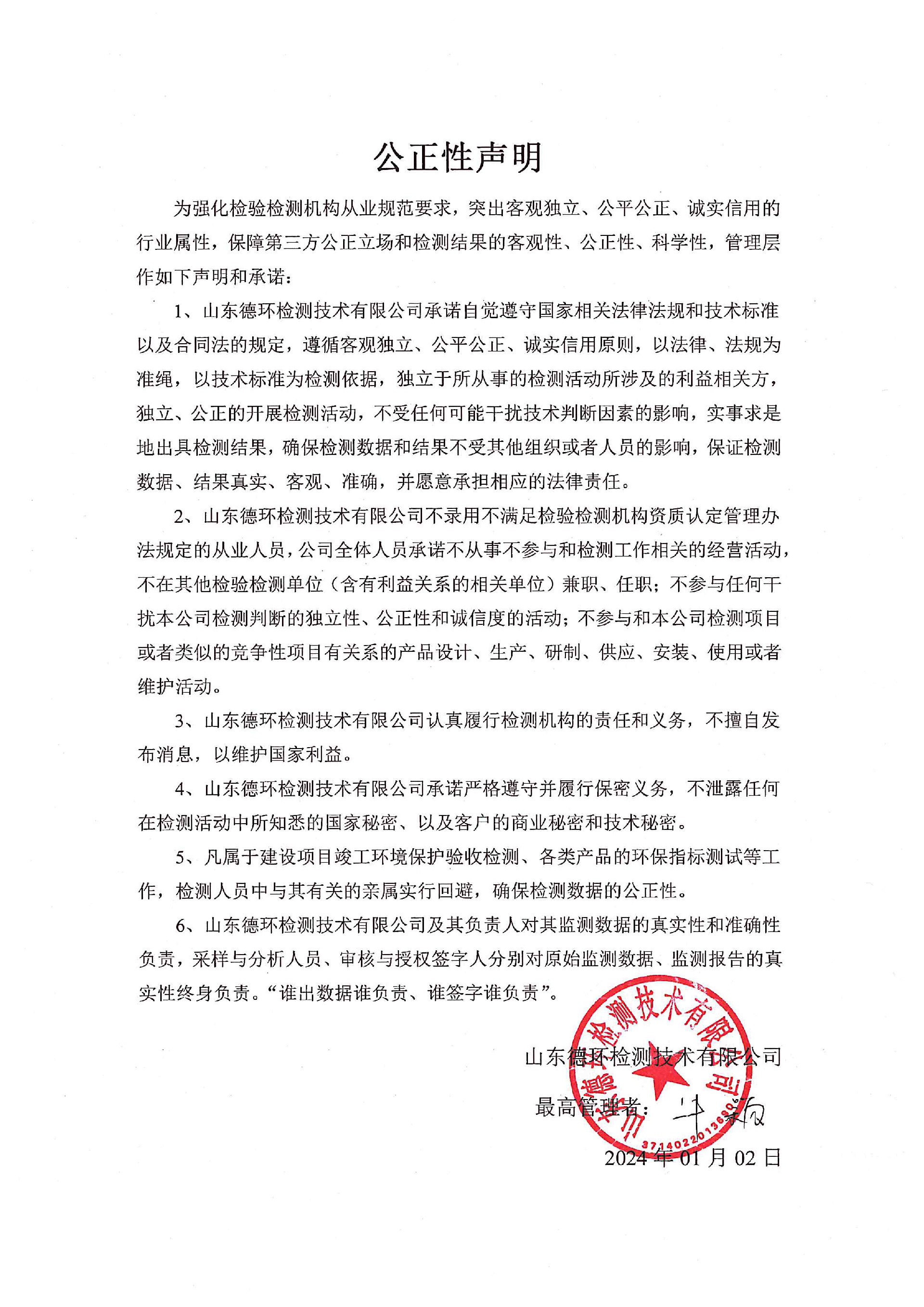 為強(qiáng)化檢驗檢測機(jī)構(gòu)從業(yè)規(guī)范要求,突出客觀獨立、公平公正、誠實信用的行業(yè)屬性,保障第三方公正立場和檢測結(jié)果的客觀性、公正性、科學(xué)性,管理層作如下聲明和承諾: 1、山東德環(huán)檢測技術(shù)有限公司承諾自覺遵守國家相關(guān)法律法規(guī)和技術(shù)標(biāo)準(zhǔn)以及合同法的規(guī)定,遵循客觀獨立、公平公正、誠實信用原則,以法律、法規(guī)為準(zhǔn)繩,以技術(shù)標(biāo)準(zhǔn)為檢測依據(jù),獨立于所從事的檢測活動所涉及的利益相關(guān)方,獨立、公正的開展檢測活動,不受任何可能干擾技術(shù)判斷因素的影響,實事求是地出具檢測結(jié)果,確保檢測數(shù)據(jù)和結(jié)果不受其他組織或者人員的影響,保證檢測數(shù)據(jù)、結(jié)果真實、客觀、準(zhǔn)確,并愿意承擔(dān)相應(yīng)的法律責(zé)任。 2、山東德環(huán)檢測技術(shù)有限公司不錄用不滿足檢驗檢測機(jī)構(gòu)資質(zhì)認(rèn)定管理辦法規(guī)定的從業(yè)人員,公司全體人員承諾不從事不參與和檢測工作相關(guān)的經(jīng)營活動,不在其他檢驗檢測單位(含有利益關(guān)系的相關(guān)單位)兼職、任職;不參與任何干擾本公司檢測判斷的獨立性、公正性和誠信度的活動;不參與和本公司檢測項目或者類似的競爭性項目有關(guān)系的產(chǎn)品設(shè)計、生產(chǎn)、研制、供應(yīng)、安裝、使用或者維護(hù)活動。 3、山東德環(huán)檢測技術(shù)有限公司認(rèn)真履行檢測機(jī)構(gòu)的責(zé)任和義務(wù),不擅自發(fā)布消息,以維護(hù)國家利益。 4、山東德環(huán)檢測技術(shù)有限公司承諾嚴(yán)格遵守并履行保密義務(wù),不泄露任何在檢測活動中所知悉的國家秘密、以及客戶的商業(yè)秘密和技術(shù)秘密。 5、凡屬于建設(shè)項目竣工環(huán)境保護(hù)驗收檢測、各類產(chǎn)品的環(huán)保指標(biāo)測試等工作,檢測人員中與其有關(guān)的親屬實行回避,確保檢測數(shù)據(jù)的公正性。 6、山東德環(huán)檢測技術(shù)有限公司及其負(fù)責(zé)人對其監(jiān)測數(shù)據(jù)的真實性和準(zhǔn)確性負(fù)責(zé),采樣與分析人員、審核與授權(quán)簽字人分別對原始監(jiān)測數(shù)據(jù)、監(jiān)測報告的真實性終身負(fù)責(zé)。“誰出數(shù)據(jù)誰負(fù)責(zé)、誰簽字誰負(fù)責(zé)”。 山東德環(huán)檢測技術(shù)有限公司 最高管理者:牛穎